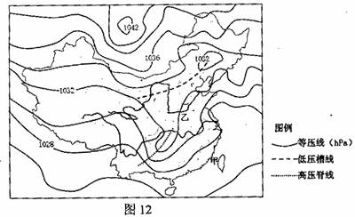 22.(20分)图12是2009年11月某日的我国天气形势图,读图回答下列问题。