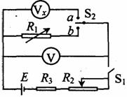 为了测定电压表Vx的内阻,采用了如图所示的电路。其中:Vx是待测电压表,量程3V,内阻约3kΩ;V是标准电压表,量程2V,内阻约2kΩ;R1是电阻箱,阻值范围是0-9999.9Ω;R2是滑动变阻器;R3是保护电阻;E是电池组,电动势6V,内阻不计;S1是单刀单掷开关,S2是单刀双掷开关.