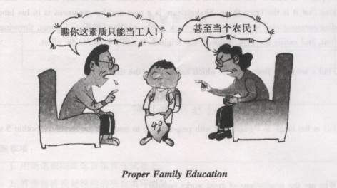 下面这幅漫画反映了目前家庭教育的一个侧面,请以Proper Family Education为题,用英语写一篇短文。根据漫画内容,结合目前的素质教育和新的人才观,谈谈你的看法。