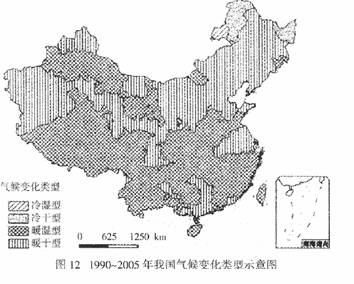 材料一 图12是1990-2005年我国气候变化类型示意图。