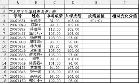 (2)在‘成绩差值’列中,在E4的位置录入“=D4-C4”后回车,结果显示“=D4-C4”,如图所示,无法显示相应数据。该单元格的数字分类可能是 ▲ 。
