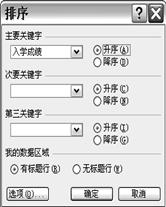 (4)对整个数据表进行排序,按‘入学成绩’由高到低排序,‘入学成绩’相同的由姓名升序的'笔划排序'而定。那么,则需要对第18题-2图中的 ▲ 、 ▲ 进行相应