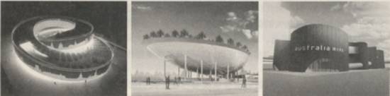 34.(1分)2010年上海世博会的许多展馆设计体现了参展国的地域文化,如①沙特馆:生命的活力88丝路宝船;②澳大利亚馆:畅想之洲88雕刻的弧形墙、丰富的红赭石外立面;③丹麦馆:“幸福生活,童话乐园”88环形轨道。下列展馆从左至右依次是
