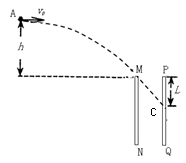 +4.0×10-5C的带电小球从两板左上方的A点以初速度v0 = 4.0m/s水平抛出,已知A点距两板上端的高度h =0.45m,之后小球恰好从MN板上端内侧M点进入两板间匀强电场,然后沿直线运动到PQ板上的C点,不计空气阻力,取g=10m/s2,求: