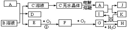 (14分)右图所示各物质是由短周期元素组成的单质及其化合物,图中部分反应条件及生成物未列出。其中A、D、K为单质,其元素在周期表中分处不同周期,且原子最外层电子数:A原子是D原子的两倍,K原子是A原子的两倍;E是能使湿润的红色石蕊试纸变蓝的气体,工业上常用C的无水晶体制备A。有关物质之间的转化关系如右图。请按要求回答: