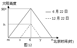 图12反映6月22日和12月22日甲地太阳高度日变化情况,乙地是甲地关于地心的对称点。据此回答23-25题。