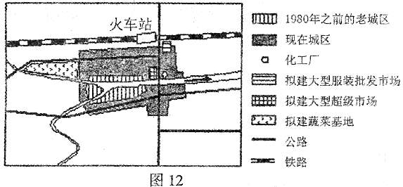 (3)随着城市社会经济的发展,拟在图示地区建大型服装批发市场、大型超级市场、蔬菜基地。请分析其选址的条件。 (7分)