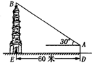 小强和小明去测量一座古塔的高度(如图),他们在离古塔60米的A处,用测角仪器得塔顶的仰角为30°,已知测角仪器高AD=1.5米,则古塔BE的高约为( )米(