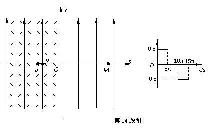 24.(22分)如图(甲)所示,在xoy平面内有足够大的匀强电场,电场方向竖直向上,电场强度E=40N/C.在y轴左侧平面内有足够大的瞬时磁场,磁感应强度B1随时间t变化规律如图(乙)所示,15π s后磁场消失,选定磁场垂直向里为正方向.在y轴右侧平面内还有方向垂直纸面向外的恒定的匀强磁场,分布在一个半径为r=0.3m的圆形区域(图中未画出),且圆的左侧与y轴相切,磁感应强度B2=0.8T.t=0时刻,一质量m=8×10-4kg、电荷量q=2×10-4C的微粒从x轴上xP=-0.8m处的P点以速度v=0.12m/s向x轴正方向入射.(计算结果保留二位有效数字)