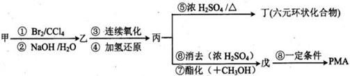 30.(16分)PMA是某种人工合成有机高分子化合物。可用作复合玻璃透明夹层、织物、皮革、纸张处理剂,胶黏剂,建筑用乳胶漆等,也可加工成各种包装材料。以来源于石油裂化气的甲为原料,通过以下途径合成PMA: