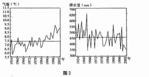 图2为我国华北地区1954~2002年气温与年降水量变化示意图,据图回答2~4题。