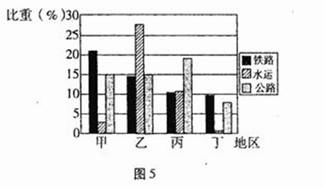 图5为我国长江中下游地区、黄河中下游地区、西北地区和西南地区三种货运方式占全国的比重示意图。读图回答8、9题。