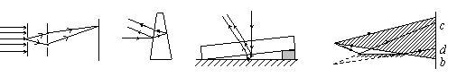 ⑵设法将同一束光分为两束(这样两束光都来源于同一个光源,因此频率必然相等)。下面4个图分别是利用双缝、利用楔形薄膜、利用空气膜、利用平面镜形成相干光源的示意图。