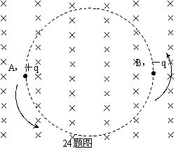 24、(19分)如图24题图所示,两个质量分别为mA和mB粒子A和B,其电量大小均为q,但A带正电,B带负电,在匀强磁场中做逆时针的匀速圆周运动。磁感应强度大小未知,磁场方向垂直于纸面向里。实验中观察到它们之间的距离始终为L,且它们做匀速圆周运动的圆心都正好是它们连线的中心,它们做匀速圆周运动的速度大小都相同。在本题中重力忽略不计,但要考虑它们之间的库仑作用力和磁场对它们的洛仑兹力。求:它们做匀速圆周运动线速度的大小和磁感应强度的大小