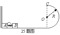 (20分)光滑水平面上放着质量mA=1kg的物块A与质量mB=2kg的物块B,A与B均可视为质点,A靠在竖直墙壁上,A、B间夹一个被压缩的轻弹簧(弹簧与A、B均不拴接),用手挡住B不动,此时弹簧弹性势能EP=49J。在A、B间系一轻质细绳,细绳长度大于弹簧的自然长度,如图所示。放手后B冲上与水平面相切的竖直半原光滑轨道,其半径R=0.5m,B恰能到达最高点C。取g=10m/s2,求