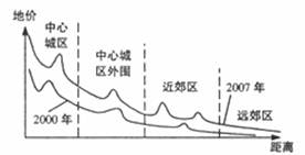 2在2007年地价变化曲线上,近郊区地价出现了两个峰值,根据城市功能分区理论模型