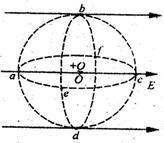 如图所示匀强电场E的区域内,在O点处放置一点电荷+Q。a.b.c.d.e.f为以O点为球心的球面上的点,acef平面与电场线平行,bdef平面与电场垂直,则下列说法中正确的是:
