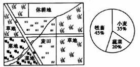 图为“某地土地利用图(左)和农业产值构成图(右)”,完成15-16题。