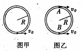 (2)现将管道水平放置在光滑水平面上,管直径两端A、B处有两个与第一问完全相同的小球(如图乙),初速度仍均为v0,当两球相遇时,小球速度大小为多少?