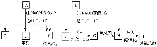 8.有A、B两种有机物,分子式都是C6H12O2,它们都不能和金属钠反应,但都能发生水解反应。A水解后生成甲、乙两种物质,甲物质发生银镜反应,乙物质与浓H2SO4共热不能脱水生成对应的烯烃。B水解后得到丙和丁两种物质,丙经催化氧化生成戊,戊能发生银镜反应,戊氧化的结果产生丁。试写出A和B的结构简式。 9.芳香化合物A、B互为同分异构体,A经①、②两步反应得C、D和E。B经①、②两步反应得E、F和H。上述反应过程、产物性质及相互关系如图所示。其中E只能得到两种一溴取代物,I(过氧乙酸)的结构简式为: