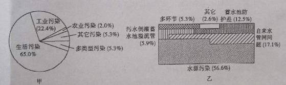 2007年7月,我国颁布实施了新的饮水国家标准。目前,饮用水安全问题仍然存在。下图中甲为“近20年来导致我国饮用水污染事故的污染物类型构成图”,乙为“近20年来我国饮用水污染事故的发生环节构成图”。读图并结合所学知识回答问题。