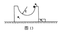 (12分)如图13所示,m1(为叙述方便,其质量即用m1表示,下同)为有半径R=0.5m的竖直半圆槽的物体,另一物体m2与m1紧靠在一起共同置于光滑水平面上。一质量为m3=0.5kg的小球从光滑半圆槽的最高点无初速下滑,若m1=m2=1kg,取g=10m/s2。求: