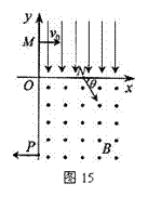 (12分)在平面直角坐标系xOy中,第Ⅰ象限存在沿y轴负方向的匀强电场,第Ⅳ象限存在垂直于坐标平面向外的匀强磁场,磁感应强度为B。一质量为m、电荷量为q的带正电的粒子从y轴正半轴上的M点以速度v0垂直于y轴射入电场,经x轴上的N点与x轴正方向成θ=60°角射入磁场,最后从y轴负半轴上的P点垂直于y轴射出磁场,如图15所示。不计粒子重力,求
