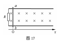 (15分)如图17所示,质量为m的跨接杆ab可以无摩擦地沿水平的导轨滑行,两轨间宽为L,导轨与电阻R连接,放在竖直向下的匀强磁场中,磁感强度为B。杆从x轴原点O以大小为vo的水平初速度向右滑行,直到静止。已知杆在整个运动过程中速度v和位移x的函数关系是:v =