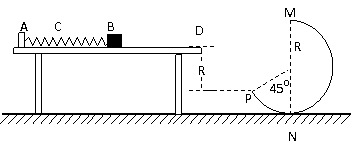 (13分)如图所示,水平桌面上有一轻弹簧,左端固定在A点,自然状态时其右端位于B点。水平桌面右侧有一竖直放置的光滑轨道MNP,其形状为半径R=0.8m的圆环剪去了左上角135°的圆弧,MN为其竖直直径,P点到桌面的竖直距离也是R。用质量m1=0.4kg的物块将弹簧缓慢压缩到C点,释放后弹簧恢复原长时物块恰停止在B点。用同种材料、质量为m2=0.2kg的物块将弹簧缓慢压缩到C点释放,物块过B点后其位移与时间的关系为