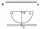 如图所示,MN是位于竖直平面内的光屏,放在水平面上的半圆柱形玻璃砖的平面部分ab与屏平行。由光源S发出的一束白光从半圆沿半径射入玻璃砖,通过圆心O再射到屏上。在水平面内以O点为圆心沿逆时针方向缓缓转动玻璃砖,在光屏上出现了彩色光带。当玻璃砖转动角度大于某一值时,屏上彩色光带中的某种颜色的色光首先消失。有关彩色的排列顺序和最先消失的色光是
