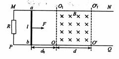 矩形区域内有垂直导轨平面向下、宽度为d的匀强磁场,磁感应强度为B,一质量为m、电阻为r的导体棒ab,垂直搁置于导轨上,与磁场左边界相距d0,现用一个大小为F的水平向右的恒力拉ab棒,使它由静止开始运动,在棒ab离开磁场前已经做匀速直线运动(棒ab与导轨始终保持良好的接触,导轨电阻不计),求:
