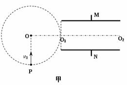 (20分)如图甲所示,在真空中半径为r的虚线所围的圆形区域内存在匀强磁场,磁场方向与纸面垂直,在磁场右侧有一对平行金属板M和N,两板间距离也为r,板长为2r,两板的中心线O1O2与磁场区域的圆心O在同一直线上,两板左端与O1也在同一直线上。今有一电荷量为q、质量为m的带正电的粒子,以速率v0从圆周上的P点沿垂直于半径OO1并指向圆心O的方向进入磁场,当从圆周上的O1点飞出磁场时,给M、N板加上如图乙所示电压u,最后粒子刚好以平行于N板的速度从N板边缘飞出,不计平行金属板两端的边缘效应及粒子所受的重力,求:
