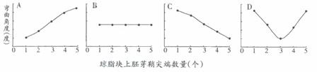 在5个相同的琼脂块上分别放置1-5个水稻胚芽鞘尖端,几小时后将这些琼脂块分别紧贴于5个切去尖端的胚芽鞘切面一侧,经暗培养后,测定胚芽鞘弯曲角度(如右图所示)。正确的结果是( )