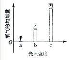 取某种植物生长状态一致的新鲜叶片,用打孔器打出若干圆片,圆片平均分成甲、乙、丙三组,每组各置于一个密闭装置内,并分别给予a、b、c三种不同强度的光照,其他条件一致。照光相同时间后,测得各装置内氧气的增加量如图所示,下列叙述错误的是( )