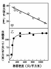 5.经调查数个不同海岸的笠螺种群,发现其体长分布、种群生物量(该种群所有生物个体的有机物总量)与种群密度的关系如右图甲、乙所示。下列叙述何者正确?( )