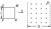 (10分)如图所示,用质量为m、电阻为R的均匀导线做成边长为l的单匝正方形线框MNPQ,线框每一边的电阻都相等。将线框置于光滑绝缘的水平面上。在线框的右侧存在竖直方向的有界匀强磁场,磁场边界间的距离为2l,磁感应强度为B。在垂直MN边的水平拉力作用下,线框以垂直磁场边界的速度v匀速穿过磁场。在运动过程中线框平面水平,且MN边与磁场的边界平行。求:(1)线框MN边刚进入磁场时,线框中感应电流的大小;(2)线框MN边刚进入磁场时,M、N两点间的电压UMN;(3)在线框从MN边刚进入磁场到PQ边刚穿出磁场的过程中,水平拉力对线框所做的功W。w.w.^w.k.s.5*