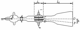 (11分)1897年汤姆生通过对阴极射线的研究,发现了电子,从而使人们认识到原子是可分的。汤姆生当年用来测定电子比荷(电荷量e与质量m之比)的实验装置如图所示,真空玻璃管内C、D为平行板电容器的两极,圆形阴影区域内可由管外电磁铁产生一垂直纸面的匀强磁场,圆形区域的圆心位于C、D中心线的中点,直径与C、D的长度相等。已知极板C、D的长度为L1,C、D间的距离为d,极板右端到荧光屏的距离为L2。由K发出的电子,经A与K之间的高电压加速后,形成一束很细的电子流,电子流沿C、D中心线进入板间区域。若C、D间无电压,则电子将打在荧光屏上的O点;若在C、D间加上电压U,则电子将打在荧光屏上的P点,P点到O点的距离为h;若再在圆形区域内加一方向垂直于纸面向外、磁感应强度为B的匀强磁场,则电子又打在荧光屏上的O点。不计重力影响。(1)求电子打在荧光屏O点时速度的大小。(2)推导出电子比荷的表达式。(3)利用这个装置,还可以采取什么方法测量电子的比荷?w.w.^w.k.s.5*