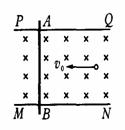 (10分)如图为某一装置的俯视图,PQ、MN为竖直放置的很长的平行金属薄板,两板间有匀强磁场,它的磁感应强度大小为B,方向竖直向下。金属棒AB搁置在两板上缘,与两板垂直且接触良好,当AB棒在两板上运动时,有一个质量为m、带电量为+q、重力不计的粒子,从两板中间(到两板距离相等)以初速度v0平行MN板射入,并恰好做匀速直线运动。问: