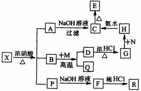 (12分)有一固体X它由两种常见元素组成,其中金属元素与另一元素的质量比为 14:1。在一定条件下X可发生下列转化,有的反应标出全部产物,有的反应标出部分产物。P为混合物气体,R是无色无味能使澄清石灰水变浑浊的气体。C为红褐色物质,M为常见金属单质。