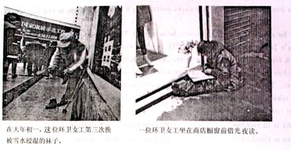 下面两张照片被传到网上后,在全国引起轰动。两个普通环卫工人的事迹感动了中国。请简要描述这两张照片,并谈谈你的感想(至少两点)。文章的开头已经给出。