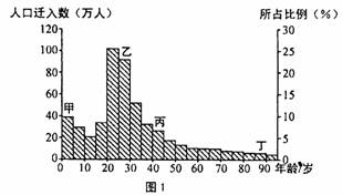 图1为某地区2007年不同年龄段人口迁移统计图。读图回答3-4题。