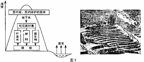 图3是云南哈尼族梯田的空间结构与物质能量流动示意图及其景观。回答i3-14题。