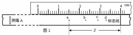 在转台开始转动达到稳定转速时,向侧面同样开有狭缝B的纸盒中喷射油漆雾滴,当狭缝A转至与狭缝B正对平行时,雾滴便通过狭缝A在纸带的内侧面留下痕迹。改变喷射速度重复实验,在纸带上留下一系列的痕迹a、b、c、d。将纸带从转台上取下来,展开平放,如图2所示。
