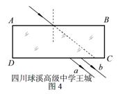 (海淀区)15.如图4所示,一束复色光斜射到置于空气中的厚平板玻璃(上、下表面平行)的上表面,复色光穿穿过玻璃后从下表面射出,变为a、b两束平行单色光。关于这两束单色光,下列说法中正确的是