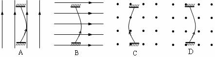2、(2009年海南物理)2.一根容易形变的弹性导线,两端固定。导线中通有电流,方向如图中箭头所示。当没有磁场时,导线呈直线状态:当分别加上方向竖直向上、水平向右或垂直于纸面向外的匀强磁场时,描述导线状态的四个图示中正确的是