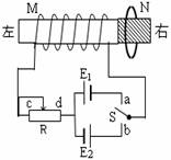 (2009年海南物理)一长直铁芯上绕有一固定线圈M,铁芯右端与一木质圆柱密接,木质圆柱上套有一闭合金属环N,N可在木质圆柱上无摩擦移动。M连接在如图所示的电路中,其中R为滑线变阻器,E1和E2为直流电源,S为单刀双掷开关。下列情况中,可观测到N向左运动的是