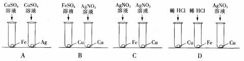 8.某化学兴趣小组,为了探究Fe、Cu、Ag三种金属活动性顺序,设计了如图所示的4种实验方案请你判断其中不能达到目的的是 ( )