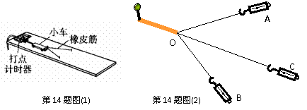 (2)某同学在做验证互成角度的两力合成的平行四边形定则的实验时,把橡皮条一端固定,另一端用A、B两个弹簧秤同时拉着到达O点位置,此时两弹簧秤的读数分别是FA=3.41 N和FB=4.18N,其位置记录如图(2)所示.倘若橡皮绳的活动端仅由一个弹簧秤拉着,也把它拉到O点位置,读得弹簧秤的读数为FC=6.14 N,其位置如C.以1 cm表示1N,作力的图示,用作图法求出FA、FB的合力大小(要说明量值)和方向(只要图示),并说明该实验的结论.用作图法求得FA、FB的合力大小为 N;实验结论是: