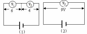3.如图(1)所示,电压表V1、V2串联接入电路中时,示数分别为6V和4V,当只有电压表V2接入电路中时,如图示(2)所示,示数为9V,电源的电动势为