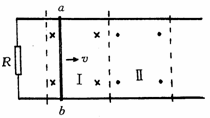 如图所示,光滑的U型金属框固定在水平面上,框中串接一电阻R,在I、Ⅱ两区域内分别存在磁感强度大小相等方向相反的竖直磁场.置于U型金属框上的金属杆ab,受水平恒定外力作用.当在I 区域内向右匀速运动时,通过电阻R的电流强度为I;当金属杆ab运动到Ⅱ区域时( )